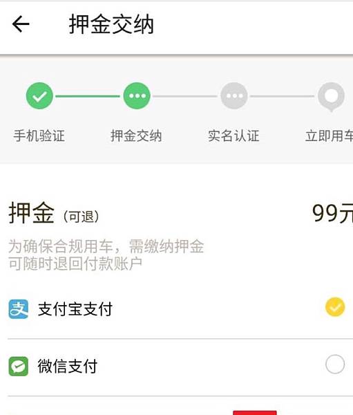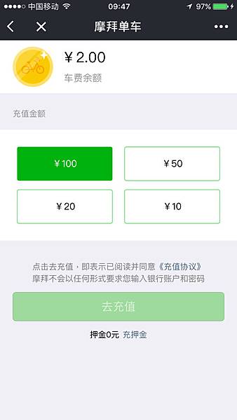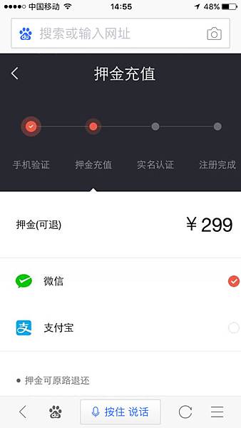 2. 充值押金...299(不用擔心退押金時需要花很長時間,我們已經退過3次都不到1分鐘就把錢退回你的支付寶了或微信支付); 不想用也了可以退押金, 等到要再騎時再充值一次押金