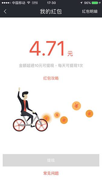 這是我騎過的紅包車... 紅包內若超過10元就可以提現到支付寶或微信支付