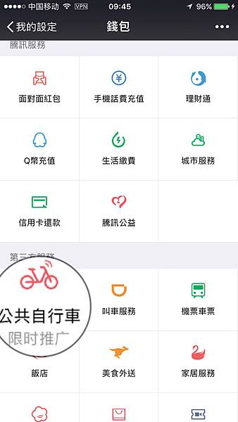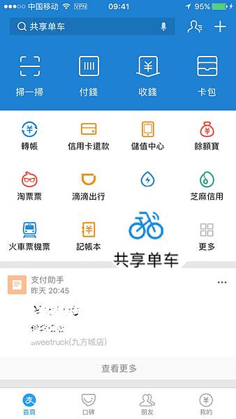 支付寶會跟根據你的定位告訴你...你所在的城市有哪些公享單車 ....共有五家單車與支付寶合作